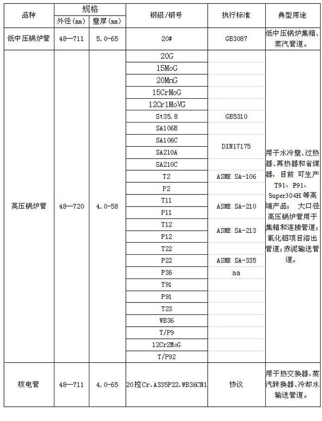 執(zhí)行GB3087、GB5310、DIN17175、ASME SA-106、ASME SA -210M、ASME SA -213M、ASME SA -335M等相關(guān)標(biāo)準(zhǔn)。用于高壓鍋爐(工作壓力一般在9.8Mpa以上,工作溫度在450℃~650℃之間)的受熱面管子、省煤器、過(guò)熱器、再熱器、石化 工業(yè)用管等。