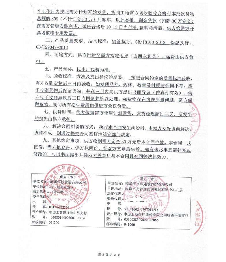 臨汾市市政建設(shè)養(yǎng)護(hù)有限公司與我公司達(dá)成預(yù)制直埋保溫鋼管采購合同,我公司確保質(zhì)量為原則,保障工期為根本,贏得了客戶的好評。